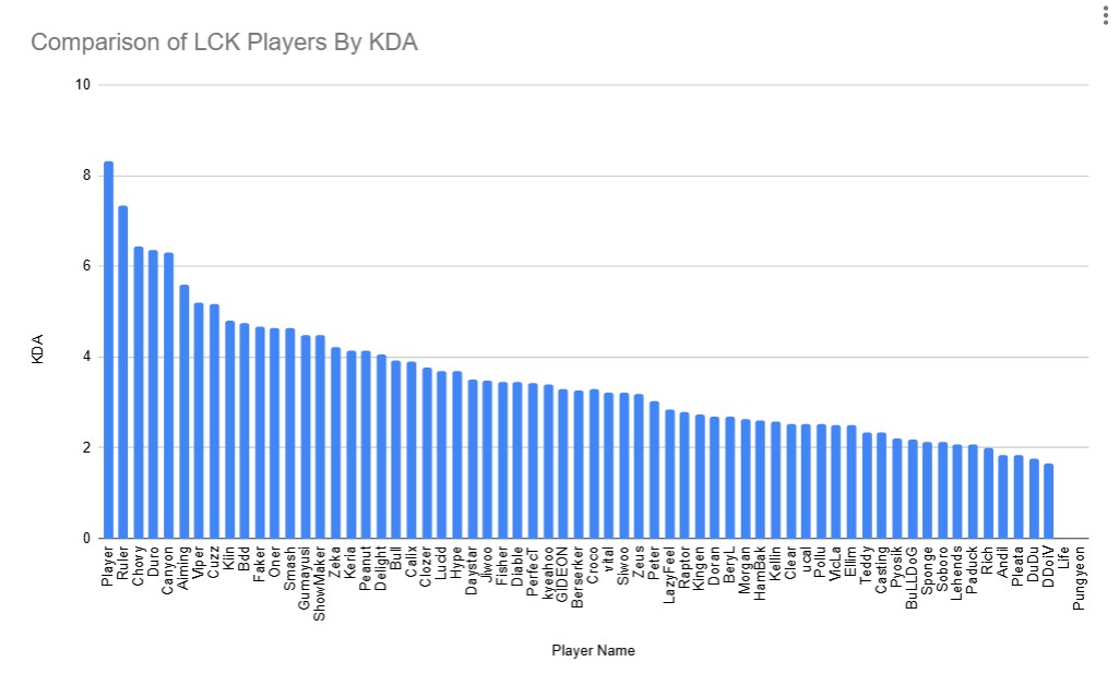 This bar chart answers the most direct question: "Who are the best individual performers?" This shows the average individual performance of players as KDA is one of the biggest indicators of relative performance during a game. This chart is effective as it allows you to see relative player rankings as it is hard to measure individual performance in a team game. A bar chart is probably the most effective way to visualize this data. As it is relatively easy to see the KDA gap between players.