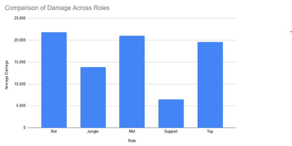 This chart shifts the focus from individual players to player *roles*. It answers the question: "Which roles are responsible for dealing the most damage?" This was created by averaging the 'DMG' column for all players within each of the five roles. The results show that mid laners and bot laners (ADCs) deal the most damage. The bar chart allows for easy comparisons visually. It allows us to come to a conclusion and further identify the jobs of each role in game.