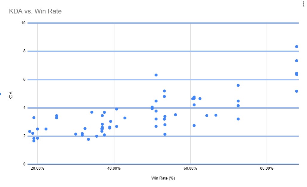 This scatter plot seeks to find a correlation between individual skill (KDA) and team success (Win Rate). Each dot on the chart represents one player from the dataset. This graph shows a strong positive correlation, indicating that KDA may have a significant impact on the outcome of the team. However, the chart also shows important outliers indicating that a player's individual performance can only carry the team so far. The scatter plot is probably the best way to look at correlation because it displays each point as an individual dot and allows you to draw conclusions based on the dots.